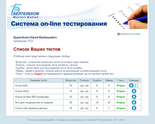 This is online learning, testing and quiz system I developed in 2011 for Beltelecom company in Belarus. It is useful for online quiz, tests, exams and certifications of staff.